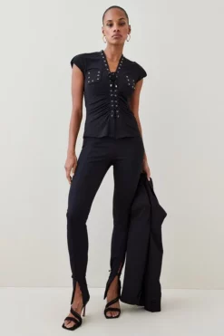 Artfully twisted with inspired reverence, this top is a visionary foray into contemporary aesthetics. Scintillating with lustrous thread, this vibrant vision is offset by voluminous sleeves for a playful finish.