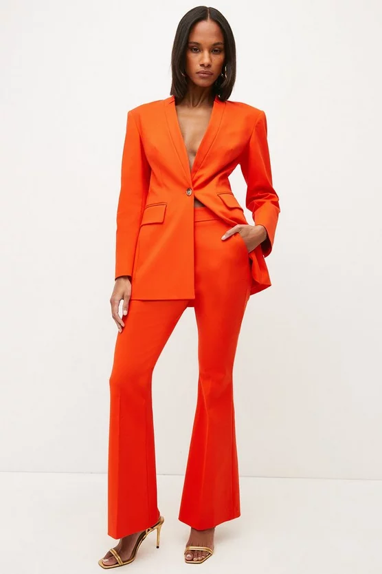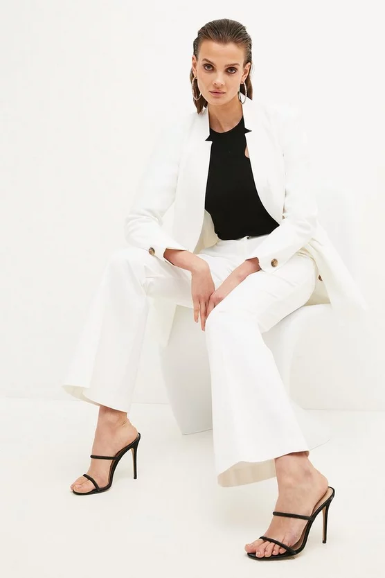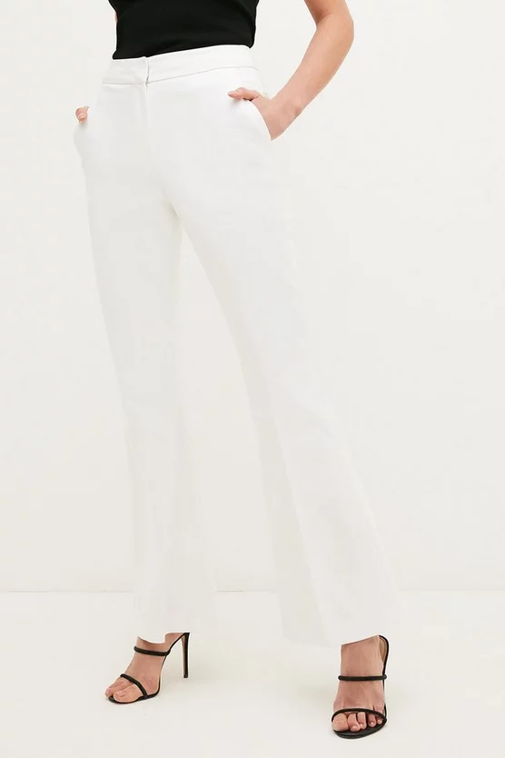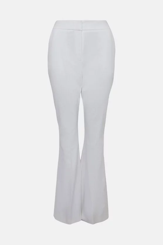 Next-level tailoring takes centre stage for these Compact Stretch trousers. Elegantly defining the silhouette with our iconic four-way stretch composition, they fall to flattering flared cuffs that accentuate the natural form. Complete with a concealed zip and hook fastening, they have pressed creases that lend a lengthening effect to the leg. Show them you mean business with the matching single-breasted blazer and powerful platforms.