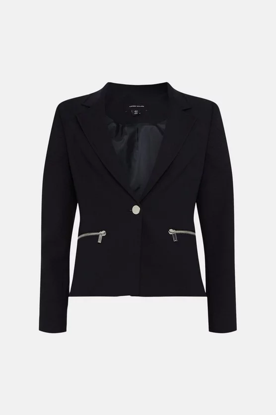 Part biker jacket, part blazer, this covetable hybrid shows off sleek tailoring and edgy silver-tone zips. With its single button closure and sharply notched lapels, this long-sleeved design is the perfect companion for smart work days or after-hours cocktails with friends.