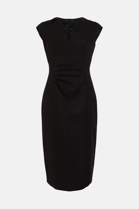 This dress embodies femininity. Defining every contour thanks to its fitted pencil silhouette and ruching waist detailing, the piece is finished off with an ultra-flattering notched detail at the neck.