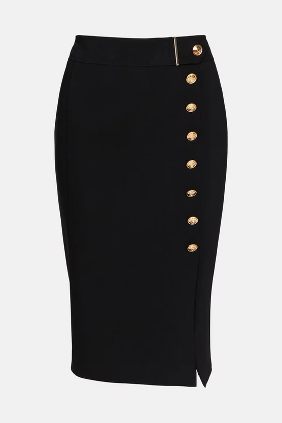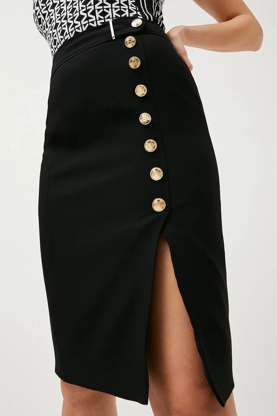 Exude femininity and everyday glamour with this expertly crafted pencil skirt. Its crafted from our signature compact stretch fabric and sustainably sourced viscose providing ease of movement and comfort. A classic design, the simple button detailing across the front brings subtle flair. Pair with a statement top to add an element of intrigue to the design.