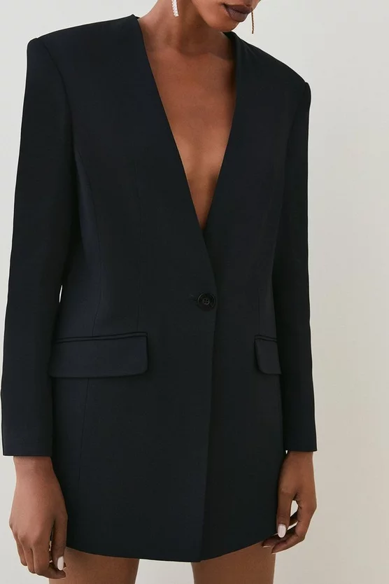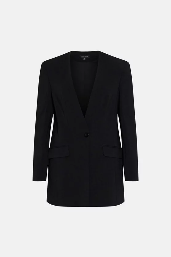 Sleek tailoring defines this contemporary blazer jacket. A collarless, single-breasted design allows for a streamlined silhouette, pair this piece with a pencil skirt or slimline trousers for a refined look.