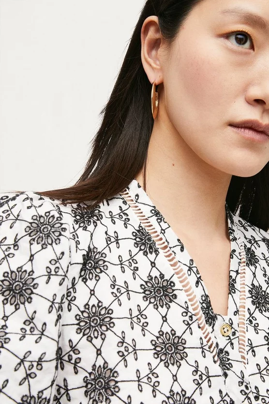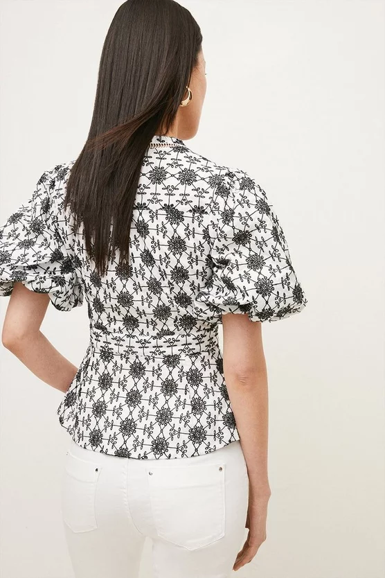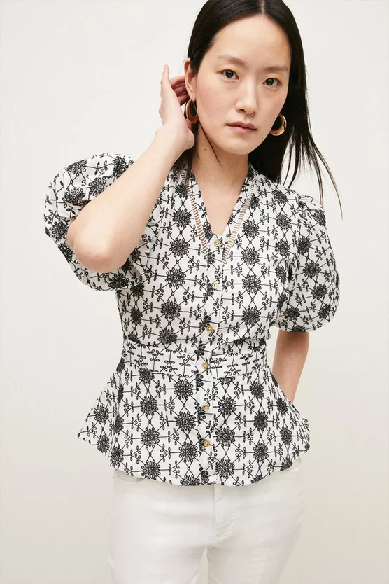 Your go-to top for summer adventures, this textured cotton broderie style features romantic puffed sleeves and a ladder-stitched neckline for a sense of artisanal allure. Fitted at the waist, it flares out into a feminine peplum hem, offsetting a row of neat buttons and touchable, textured finish.