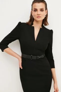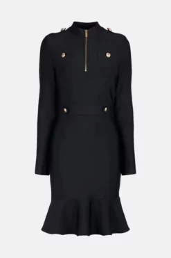Designed to sumptuously streamline your form, this tailored pencil dress is perfect for any work-to-weekend capsule collection. It features a sporty full-length zip framing the front along with faux flap pockets and ladylike three-quarter sleeves. Add pointed courts to take the look to dinner.