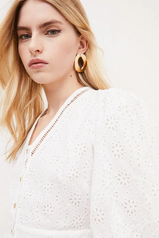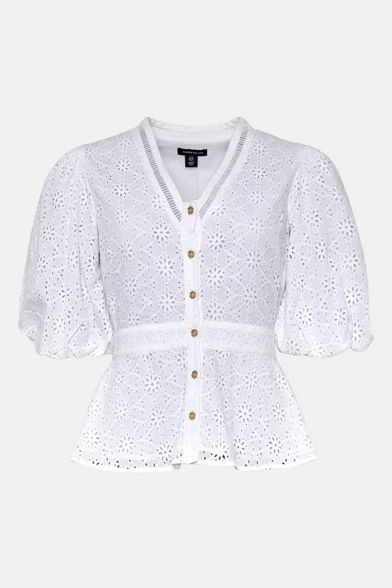 Your go-to top for summer adventures, this textured cotton broderie style features romantic puffed sleeves and a ladder-stitched neckline for a sense of artisanal allure. Fitted at the waist, it flares out into a feminine peplum hem, offsetting a row of neat buttons and touchable, textured finish.