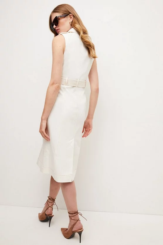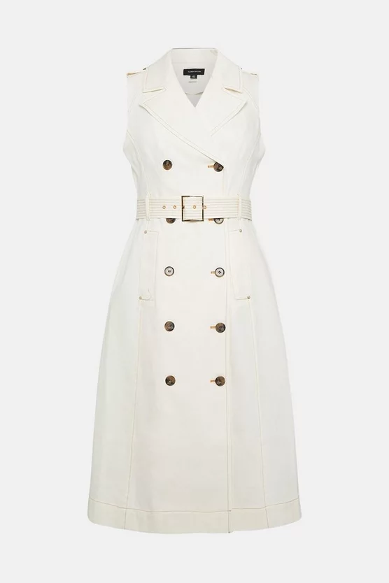 Inspired by the classic trench coat, this elegant cotton pencil dress sculpts curves to perfection thanks to its chunky buckled belt. Boasting double-breasted buttons and slip pockets, it marries practicality with a sense of polish and shows off sun-kissed shoulders beautifully. Enhance the preppy fit with spike heels and a roomy clutch bag.