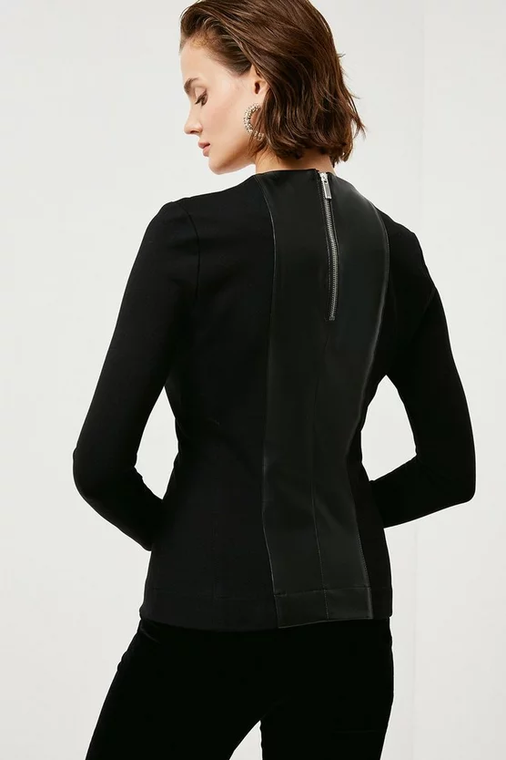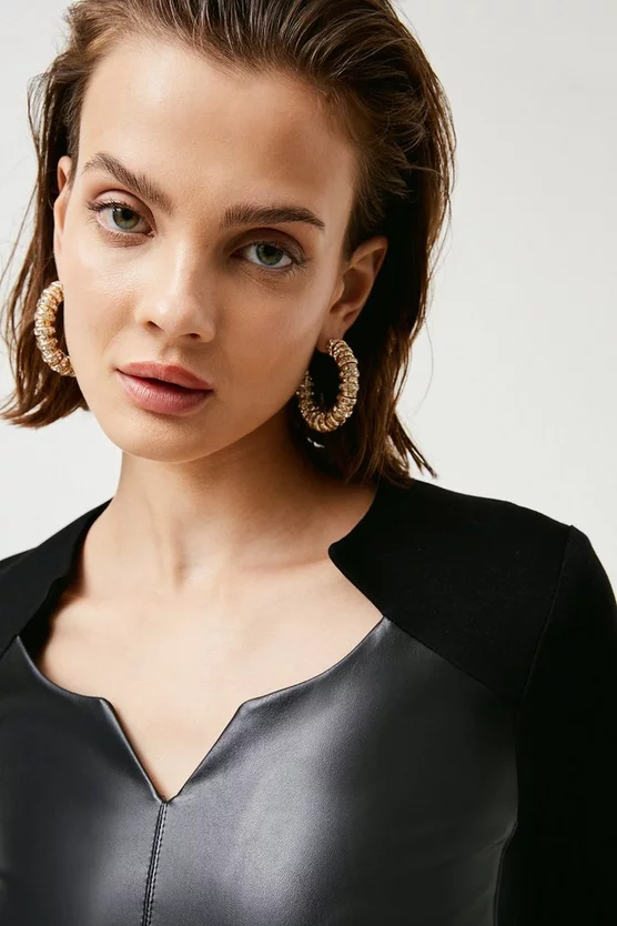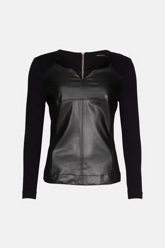 Add a streamlined effect to everyday outfits in this sculpting faux leather style. With its dual-textured tonal design and interesting notched neckline, this long-sleeved top lends a dash of elegant edge to smart-casual ensembles.