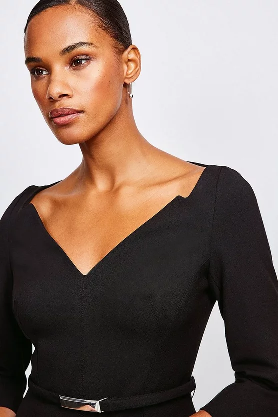 Meet the dress you’ll rely on forever. A timeless addition to any well-considered wardrobe, the piece features a high notched collar, v-neck front, puffed shoulders, three-quarter length sleeves and elegant metalwork belted waist. Crafted in our signature structured crepe, the fabric has a four-way stretch for added comfort and ease of movement.