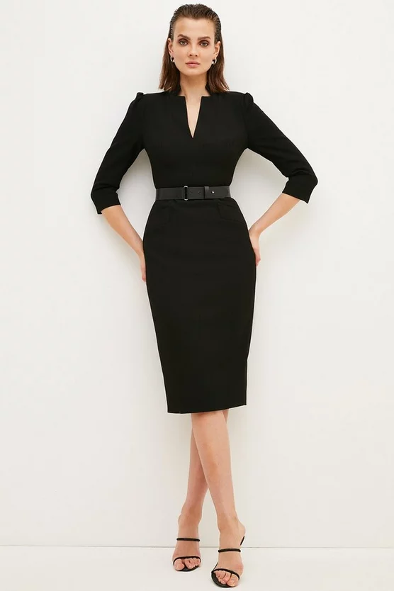 Meet the dress you’ll rely on forever. A timeless addition to any desk-to-dinner wardrobe, it features a high notched collar, V-neck front, puffed shoulders, three-quarter length sleeves, belted waist, back vent and comes in midi length.