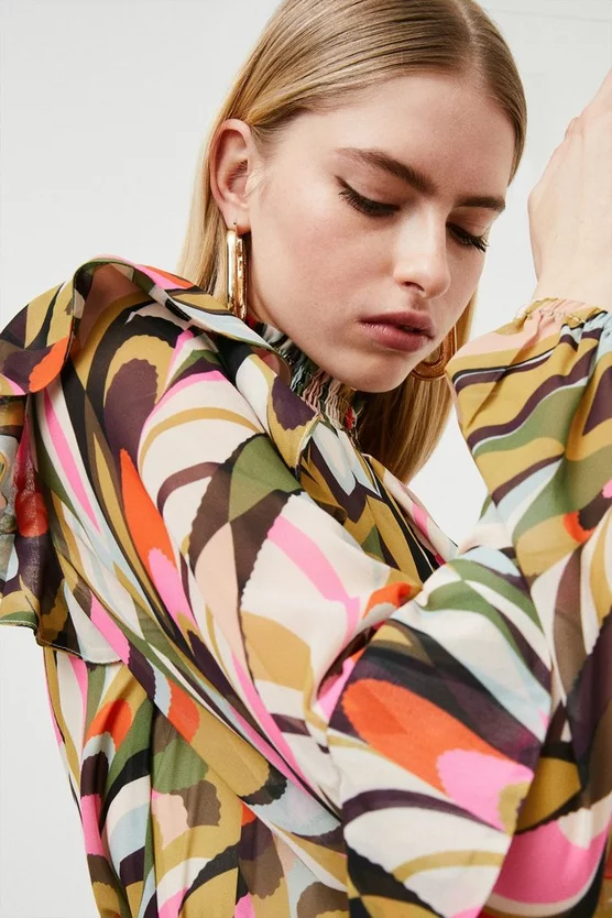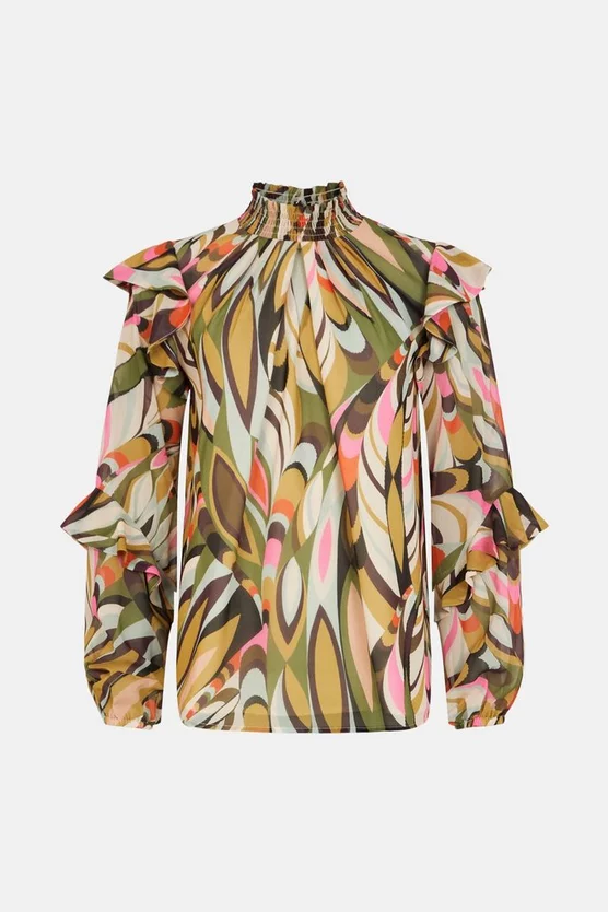 Add confidence to your everyday repertoire with this geometric-inspired Kaleidoscope print blouse. Enhanced with shirred details, it boasts a high, frill neck collar and dramatic sleeves, a great pairing with fitted jeans or leather trousers for evening and weekend dressing.