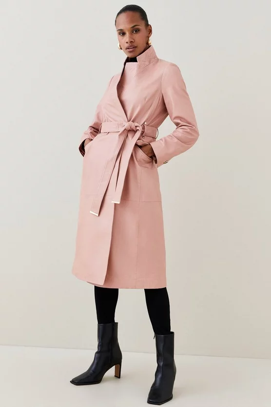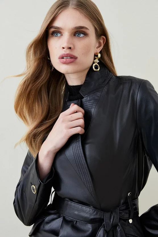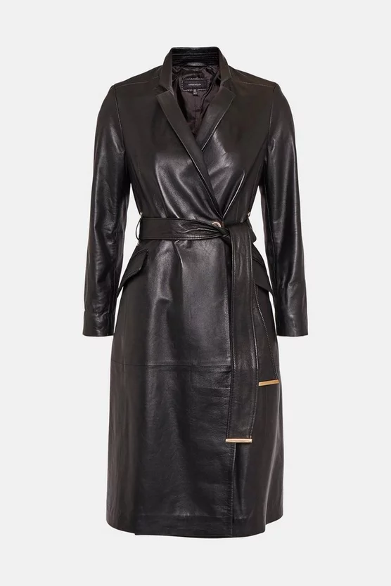 Nothing spells instant luxury quite like this sumptuous leather coat. Artfully detailed with sharply notched lapels, topstitched tonal trims and a sleek belt, it makes a truly timeless investment. Flap pockets and glossy, buttoned cuffs only add to the iconic beauty of a style youll reach for season after season.