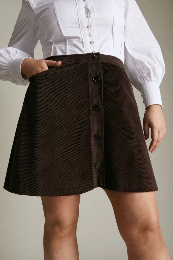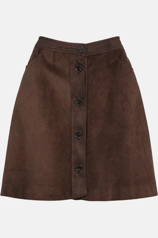Vintage-inspired corduroy and faux suede trims lend this rich chocolate-hued skirt a timeless feel. Dotted with horn-style buttons, it cinches the waist in the perfect place and pairs stylishly with the matching jacket../blazers”>blazer jacket.