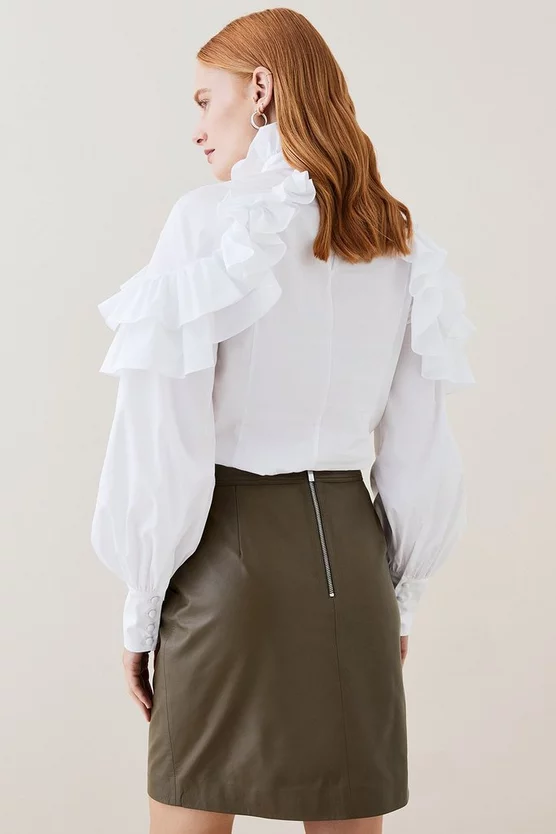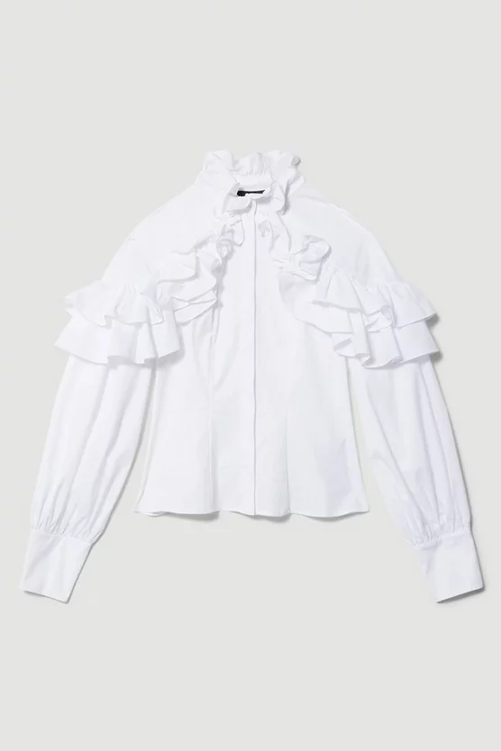 Embrace a vintage charm with this elegant ruffled blouse. Featuring intricate ruffled details which extravagantly flare out by the shoulders, this balloon sleeve blouse makes an unforgettable addition to your smart-casual wardrobe.