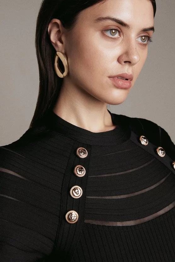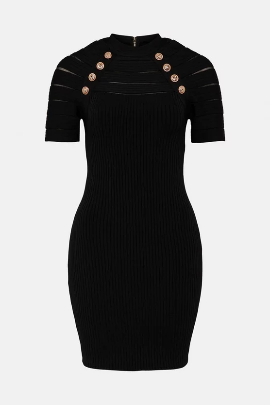 Embossed with military buttons in a trim across the top, this ribbed dress elegantly skims the figure in a form-flattering fit. Sitting just above the knee, its enhanced with a glossy zip on the back to complete with a modern flourish.