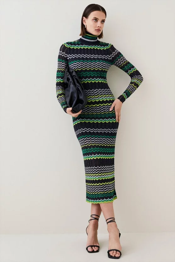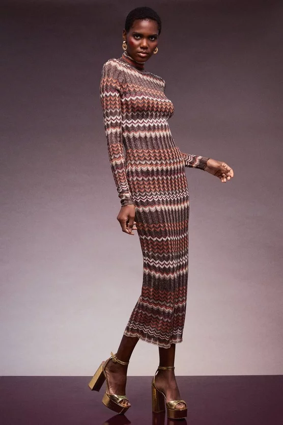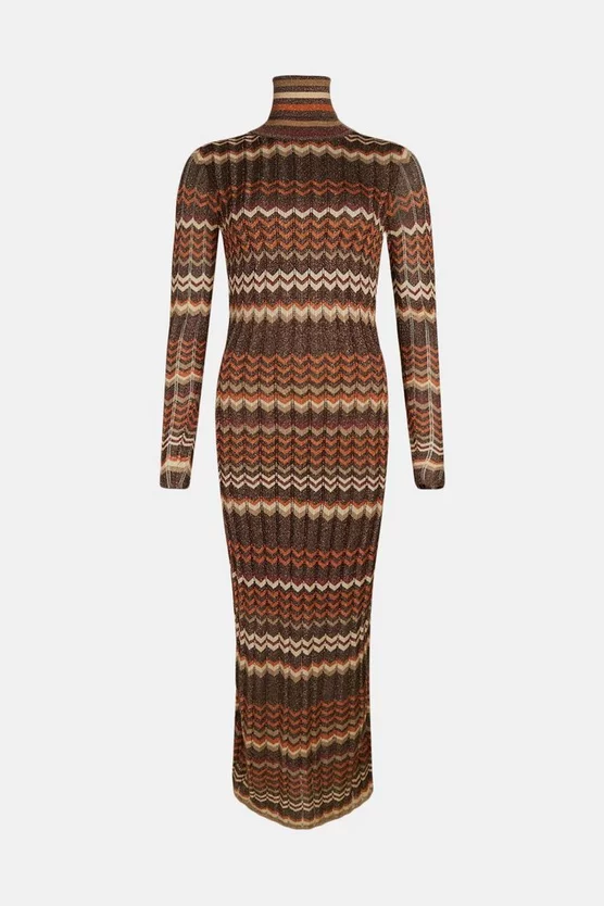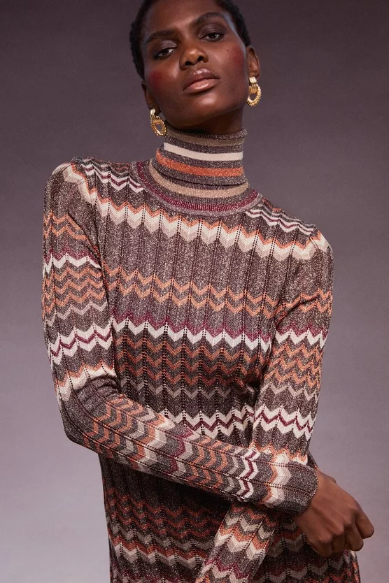 Made for retro enthusiasts, this slinky knitted midi sparkles subtly as you move, featuring a Seventies-style motif and high roll neck. Cut to enhance and embrace your figure, it looks effortlessly stylish teamed with knee-high boots and loose, tousled locks.