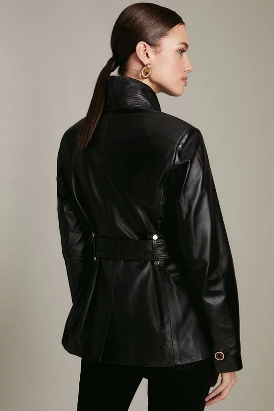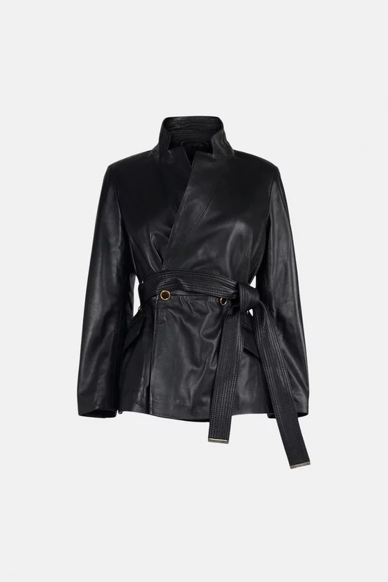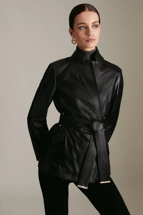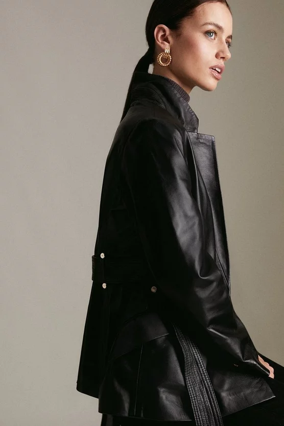 Take the spotlight and uplift your AW21 wardrobe with this luxurious coat.. Crafted in sumptuously soft leather for your comfort, it boasts a structured silhouette with a tied waist belt and silver-toned stud detailing.