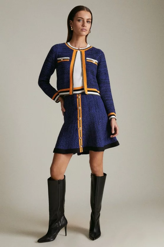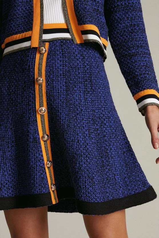 With its flattering, swishy shape and glossy gold buttons, our tweed skirt is the epitome of ladylike elegance. Subtle sparkling threads and a contrasting hem panel catch the eye with every step you take. Matching jacket available.
