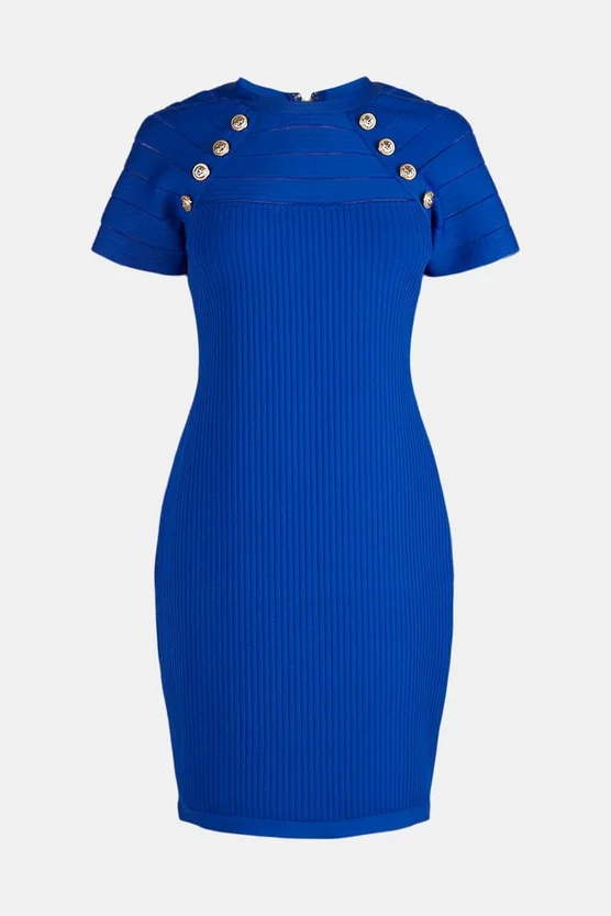 The firm structure of this rib-knit dress ensures a flawless silhouette, and is elevated by a bandage construction that moulds over the shoulders and short sleeves. Finished with ornate gold buttons on the armhole seams and an exposed gold metal zip at the back. The mini length is balanced by a high cut round neckline.