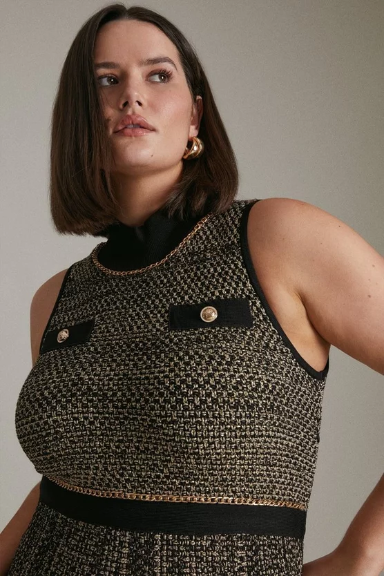 Offering the ultimate in sophistication, this sleeveless skater dress is created in a black and ivory tweed with couture chain detailing. The style is balanced with a black rib-knit funnel collar and welt detailing on the chest, while the shape is defined by a black waistband and a black band at the hem which shows off the movement of the skirt. Finished with ornate gold buttons on the chest and gold flat-link chain attached around the neckline and waist. Pair with black leather boots or a classic pump.