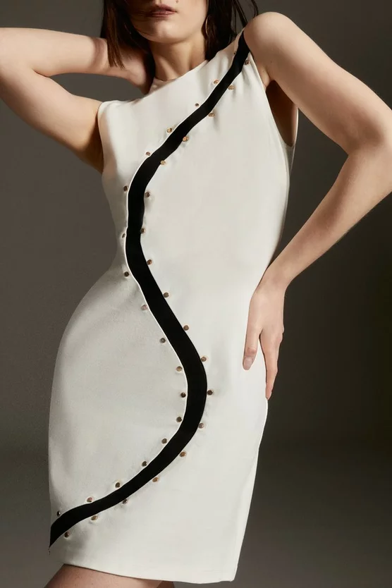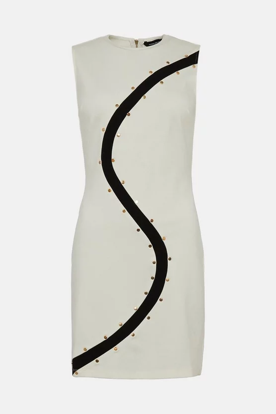 Oozing joyful 1980s appeal, this curve-sculpting mini dress features an S-shaped sweep of colour framed by edgy metallic rivets. The perfect combination of sultry and stylish, this dazzling stretchy design will fit right in at summer parties.