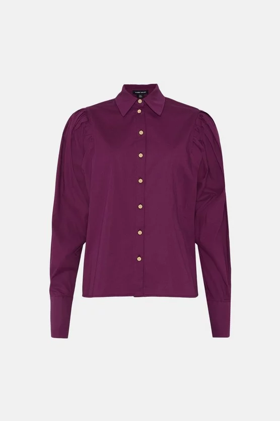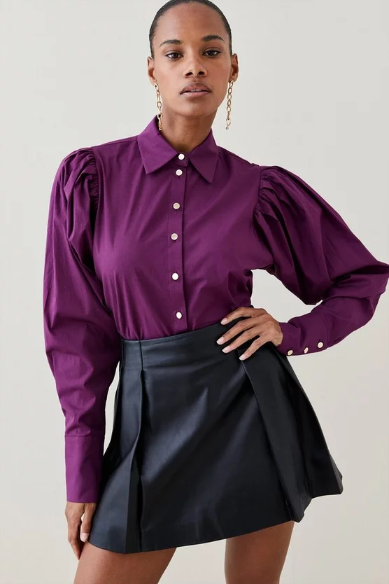 Donβt leave the drama to your favourite party dress. This crisp poplin shirt is ideal for dressing up, featuring dramatic puffed sleeves and a sharply pointed collar. It comes lined with a neat row of glossy metallic buttons framing the front to anchor the playful proportions. Take it on your next evening out with a leather mini and heels.