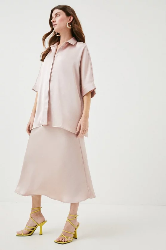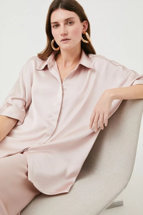 Boasting a luxe, lumiscient quality, the satin woven tunic shirt drapes the silhouette with elegant ease โ transporting you from relaxed brunches to office power dressing. Flowing from a point collar into short sleeves and a longline hem, itโs punctuated with a front button placket for easy styling. Unbutton the collar and showcase a chunky gold chain underneath for dimensional styling.