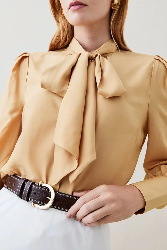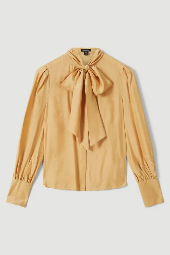 Elegant and feminine, this pussy bow blouse is a classic piece that will instantly elevate any bottoms. It is completed with slightly puffed sleeves and buttoned cuffs that lend it a modern take. Pair it with high-rise wide-leg trousers to upgrade your formal wear.