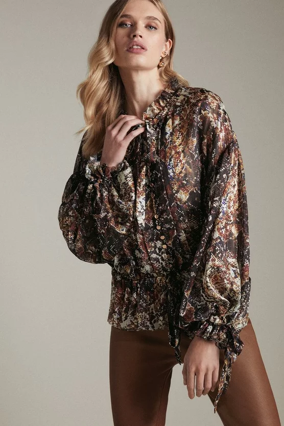 A beautiful example of bohemian styling, this gauzy snake-print blouse marries dramatic puffed sleeves with glossy buttons and tie-detail trims. Gently flounced at the hem and fitted with a ruffled neckline, it adds an alluring sense of volume to skinny jeans or tailored trousers.