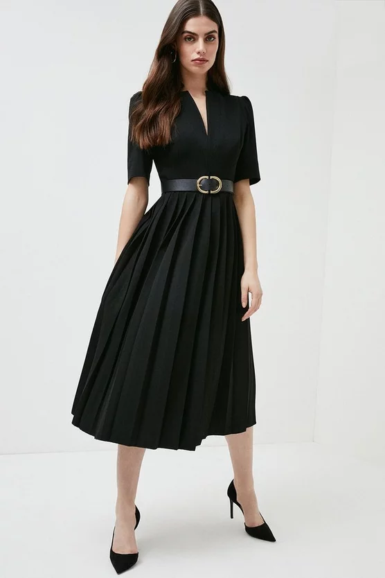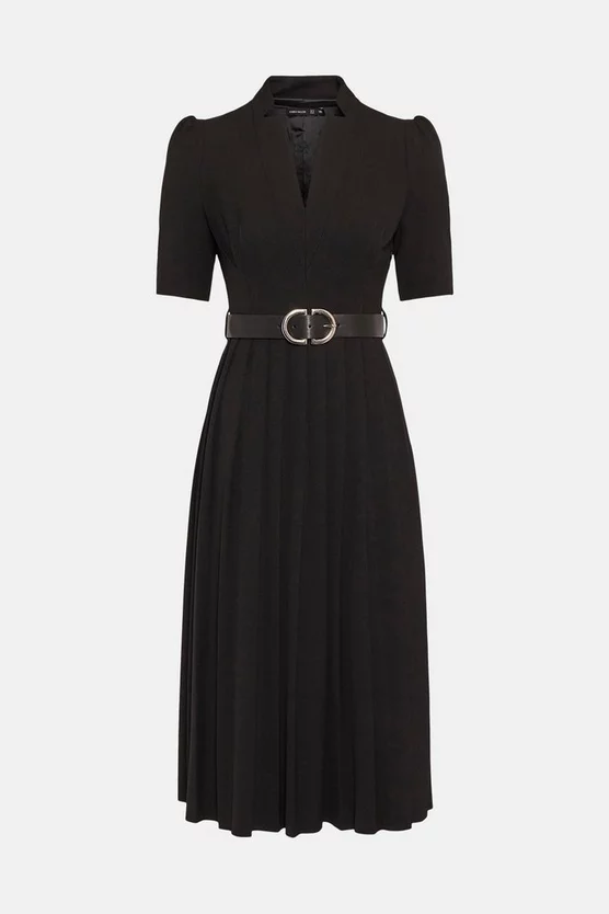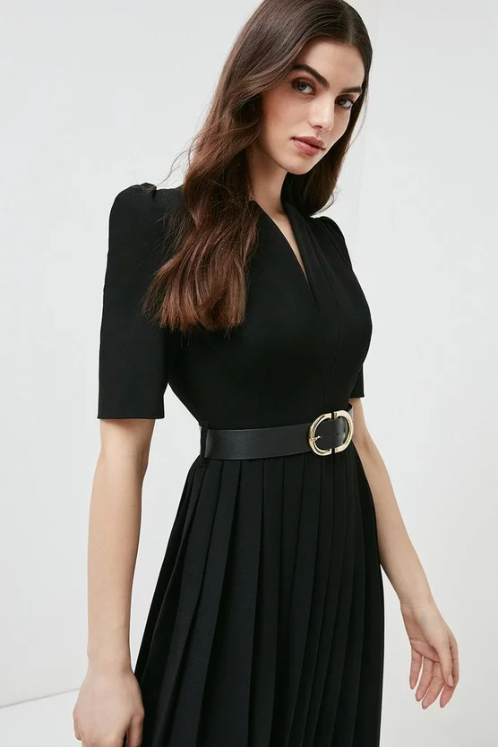Designed with precision and perfectly contouring your shape, thereβs a reason why our Forever Dress is so iconic. Reworked for the new season with a pleated skirt,, itβll move just as beautifully as you. Crafted from our signature crepe fabric, the piece features a four-way stretch for added comfort and hardware buckle belt so you can adjust the fit as you wish. Notable details come in the form of a classic Queen Anne collar, structured shoulders and elbow-length sleeves.