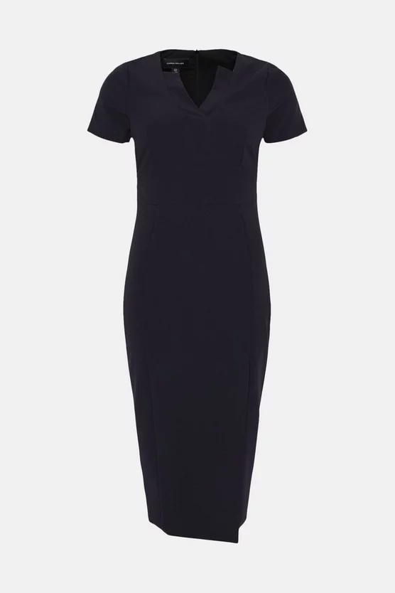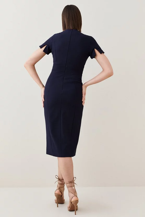 Sculpting the form with a streamlined pencil silhouette, this midi dress appears with polished appeal. Offset by a notched neckline, itβs balanced with vented trims for a sharp finish.