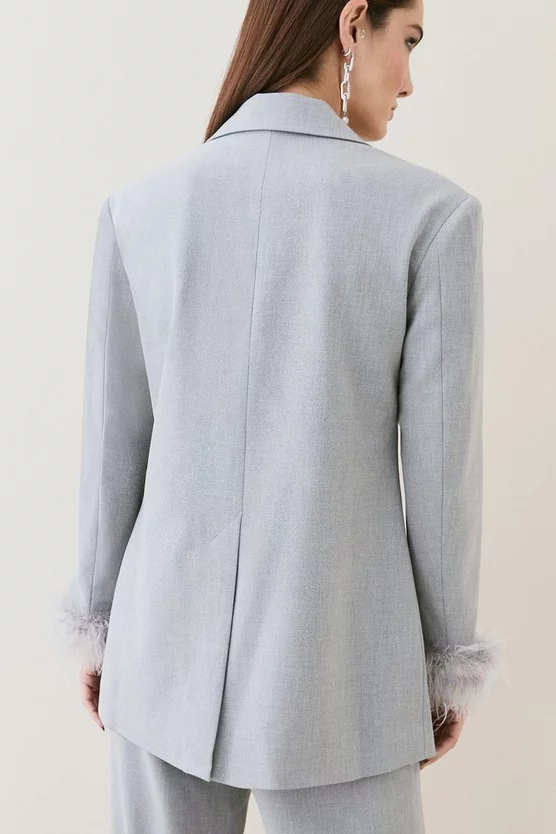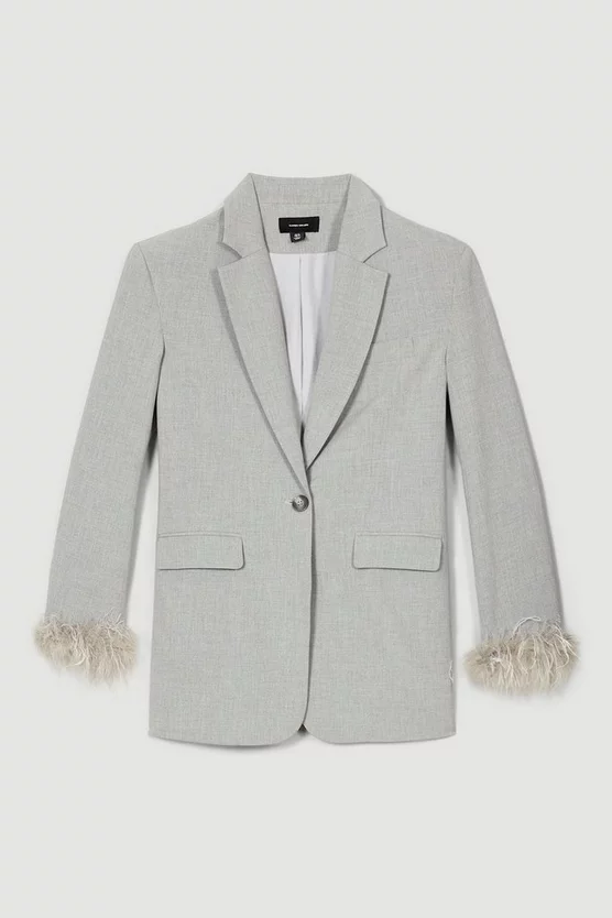 Main: 68% Polyester, 27% Viscose/Rayon, %5 Elastane/Spandex. Lining: %92 Polyester, %8 Elastane/Spandex. Trim: Feathers. Dry clean only, do not iron trim. Model wears UK 8/ US 4. Length measurement: 80cm.