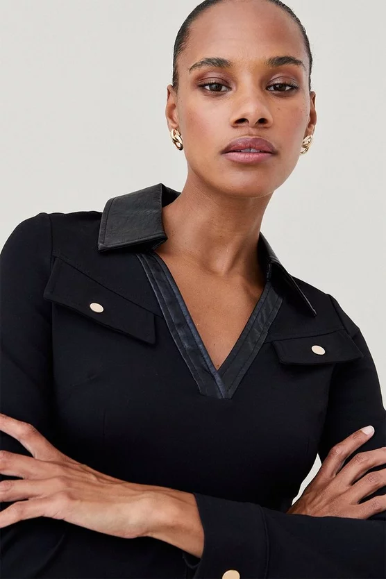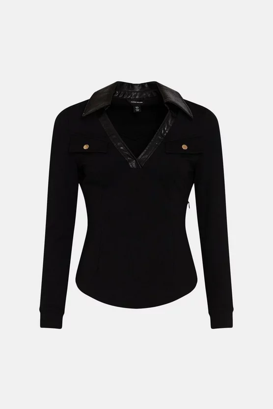 Borrow from the 70s in this smart collared top. Combining plush fabric with a faux leather collar and non-functioning flap pockets, it instantly dresses up leather mini skirts and tailored suit trousers alike.